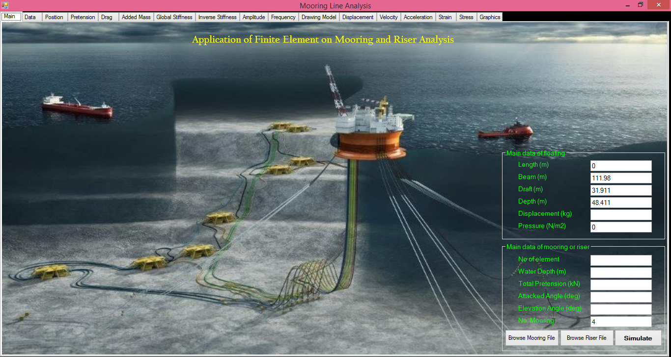 FEMorRis Software is a software to analyze displacement, velocity, acceleration and stress of mooring and risers. Ocean and Aerospace Research Institute has developed FEMorRis Software based on lumped and hydrodynamic theories.
